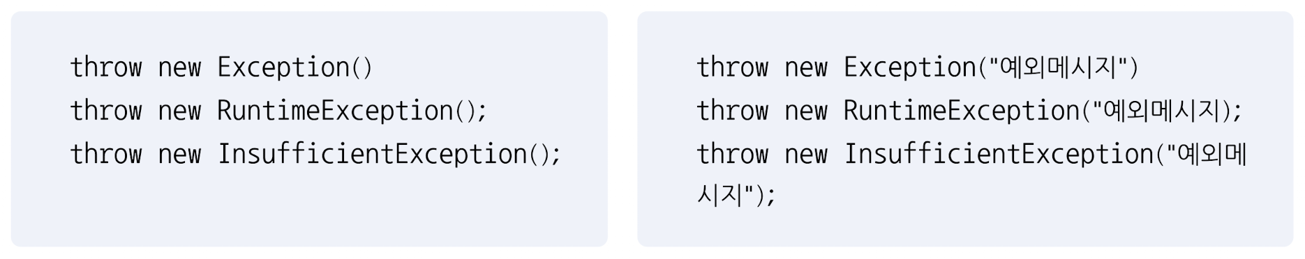 - 자바에서 제공하는 표준 예외뿐만 아니라 사용자 정의 예외를 직접 코드에서 발생시키려면 throw 키워드와 함께 예외 객체를 제공하면 된다.