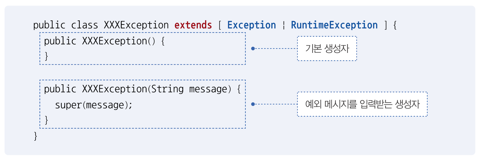 사용자 정의 예외 클래스에는 기본 생성자와 예외 메시지를 입력받는 생성자를 선언해준다.