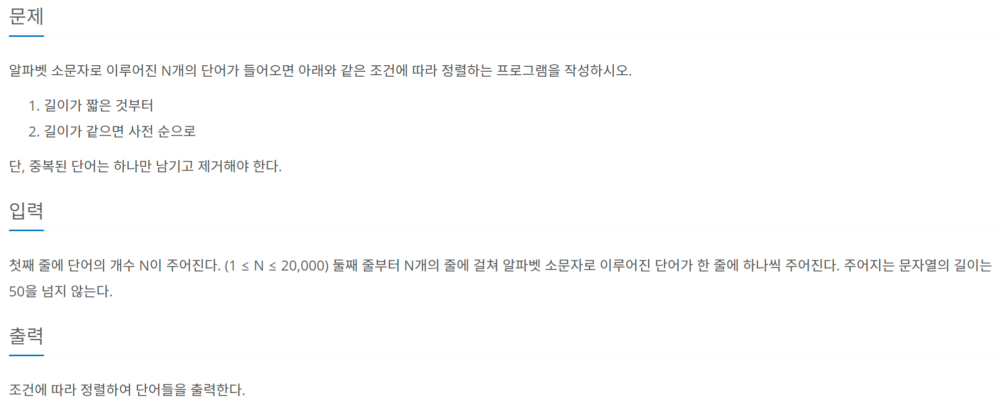 - 길이가 같지 않으면 길이가 짧은 순으로 정렬하고, 길이가 같다면 사전순으로 정렬한다.
