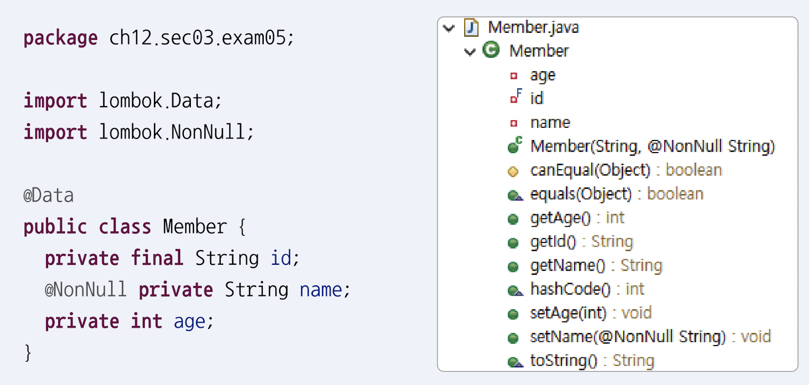 tip @Data에 포함되어 있는 @RequiredArgsConstructor는 기본적으로 매개변수가 없는 생성자를 포함시키지만, final 또는 @NonNull이 붙은 필드가 있다면 이 필드만 초기화시키는 생성자를 포함시킨다. final과 @NonNull의 차이점은 초기화된 final 필드는 변경할 수 없지만(setter가 만들어지지 않음), @NonNull은 null이 아닌 다른 값으로 setter를 통해 변경할 수 있다는 것이다.