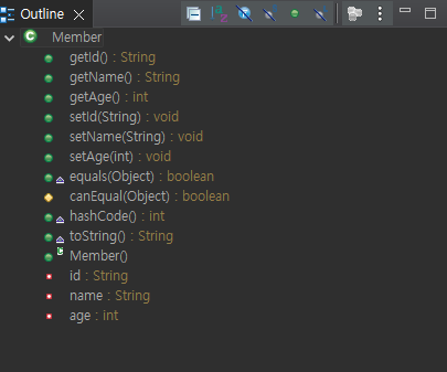 그러면 자동으로 각 필드와 getter가 생성되고 hashCode(), equals(), toString() 메소드가 자동으로 오버라이딩되어 생성된다.