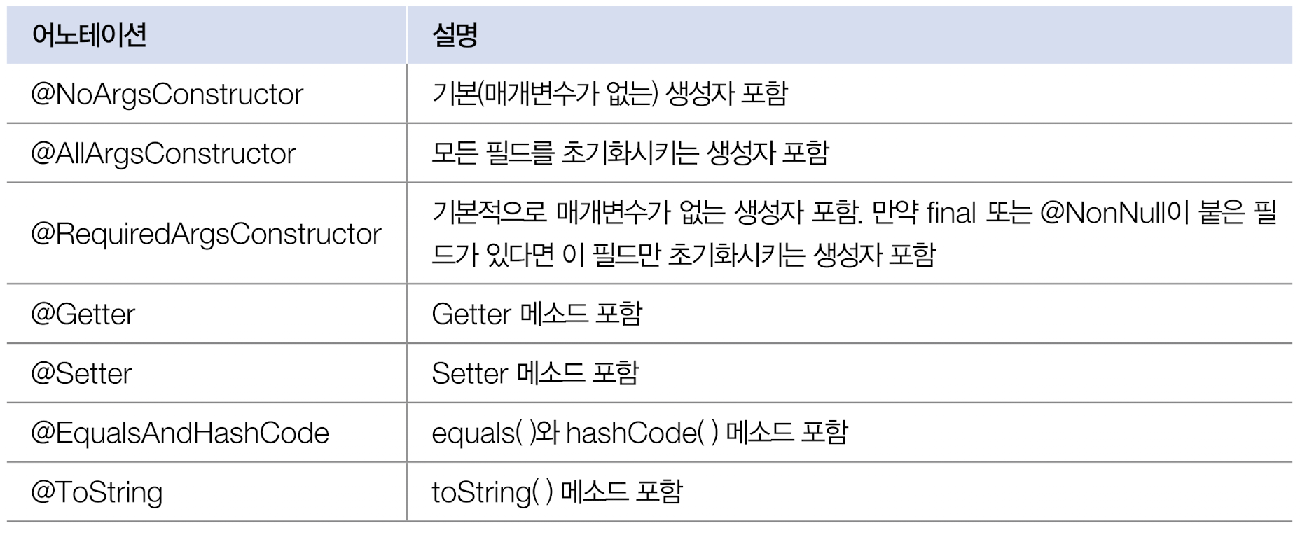 @Data 외에도 아래와 같은 어노테이션을 사용할 수 있다.