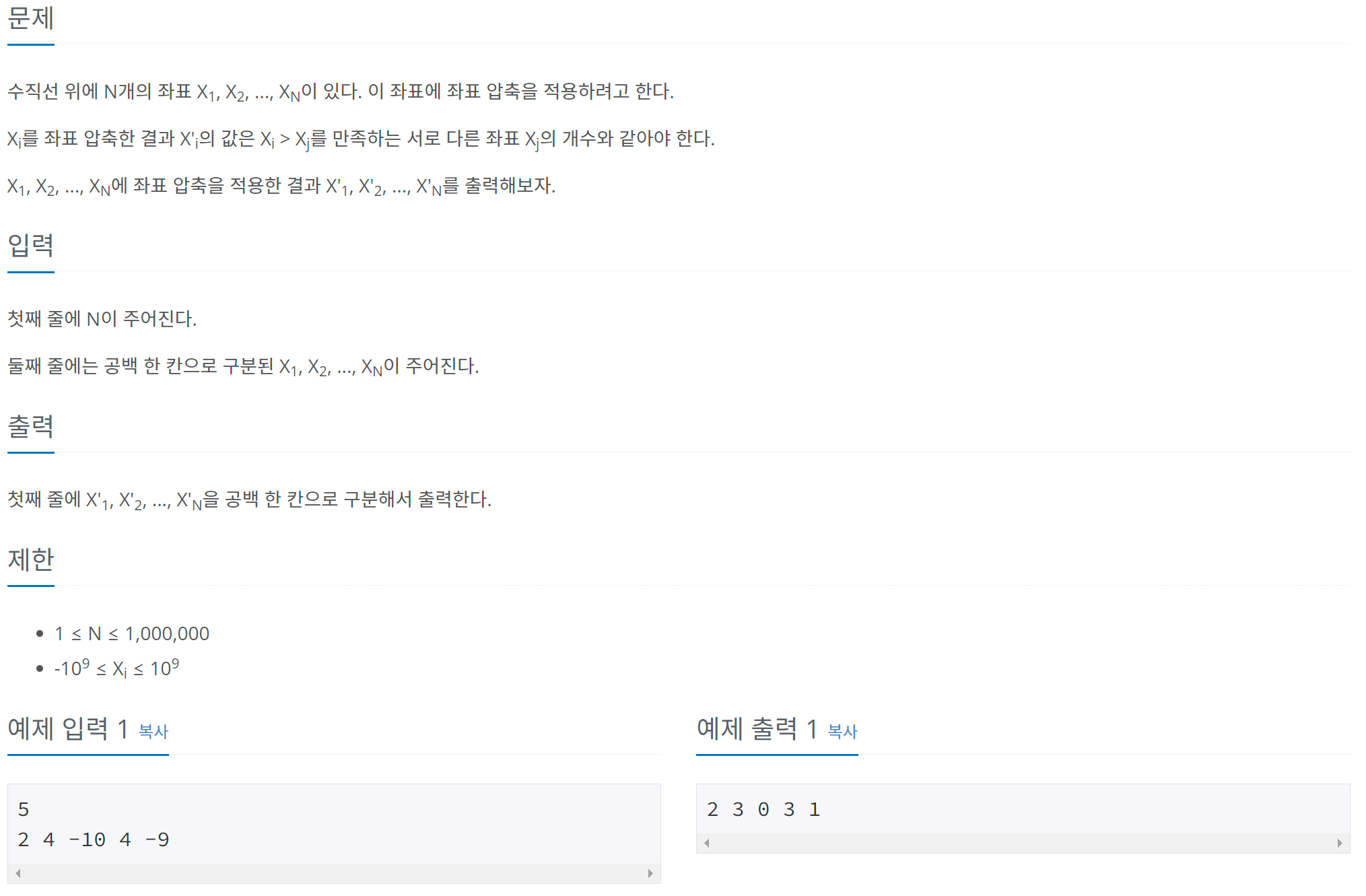 [C++] 백준 13단계 - 18870번 문제 (좌표 압축)자료구조 & 알고리즘/BOJ2023. 7. 19. 21:33