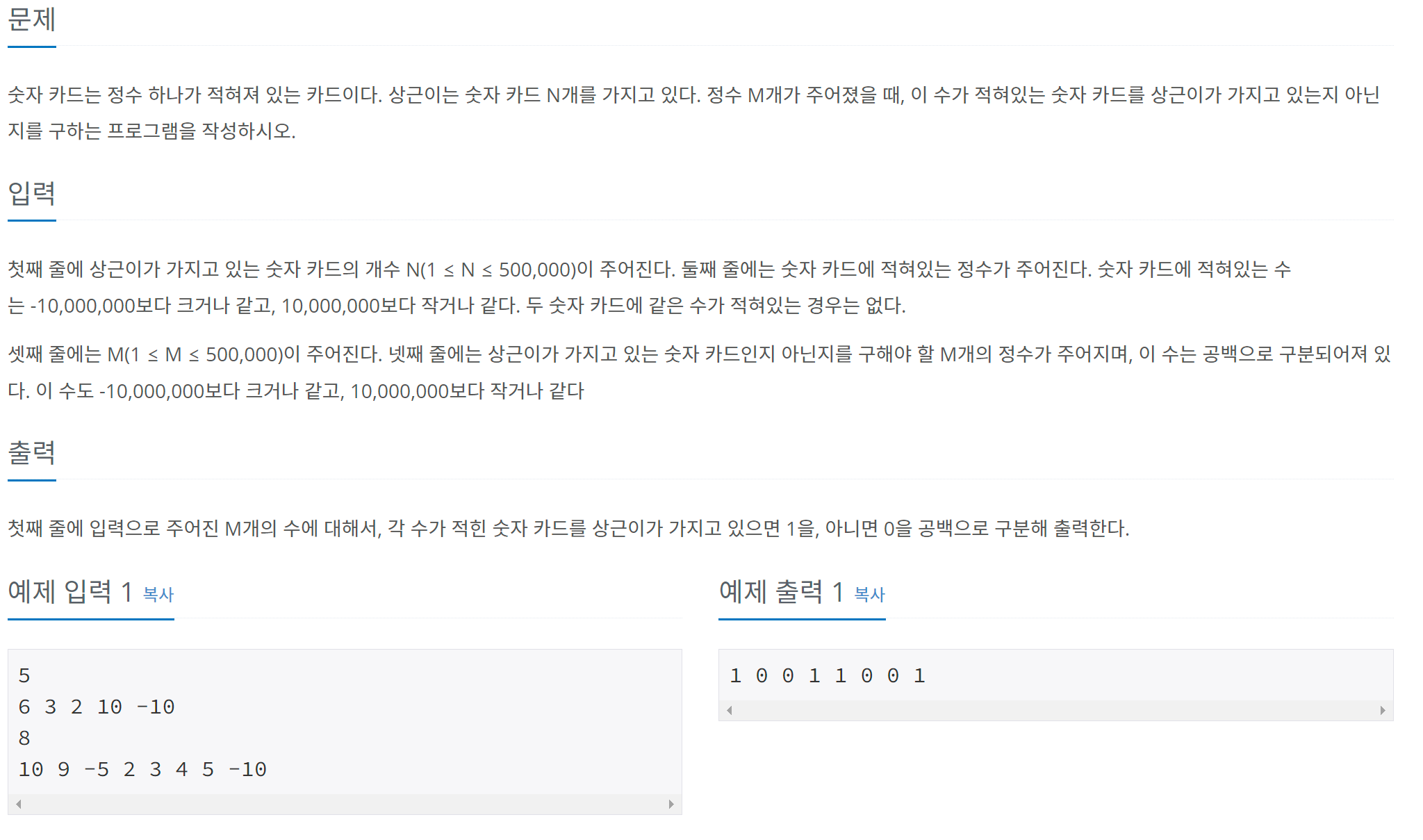 [C++] 백준 14단계 - 10815번 문제 (숫자 카드)자료구조 & 알고리즘/BOJ2023. 7. 20. 23:27