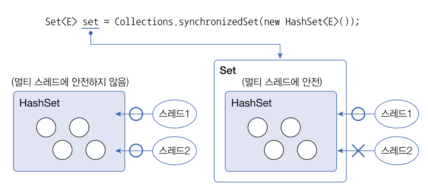이런 경우를 대비해서 컬렉션 프레임워크는 비동기화된 메소드를 동기화된 메소드로 래핑하는 Collections의 synchronizedXXX() 메소드를 제공한다.
