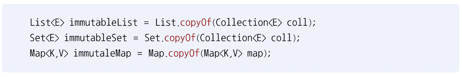 List, Set, Map 인터페이스의 정적 메소드인 copyOf()을 이용해 기존 컬렉션을 복사하여 수정할 수 없도록 할 수 있다.
