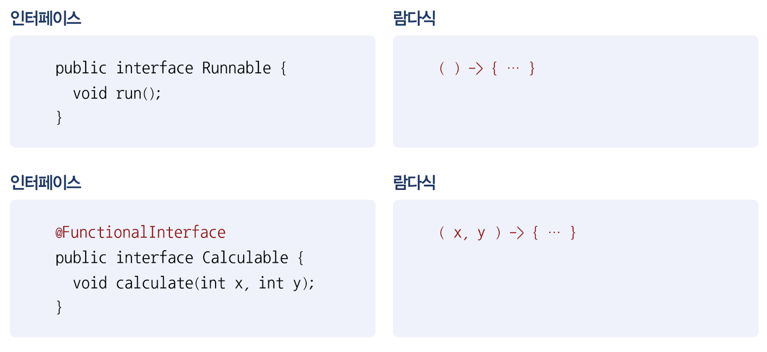참고사항 -인터페이스의 익명 구현 객체를 람다식으로 표현하려면 인터페이스의 추상 메소드가 단 하나여야 한다. -인터페이스가 단 하나의 추상 메소드를 가질 때, 이를 함수형 인터페이스라고 한다.(static, default 메서드가 여러 개인것은 상관 없음) -인터페이스가 함수형 인터페이스임을 보장하기 위해서는 @FunctionalInterface 어노테이션을 붙이면 된다.