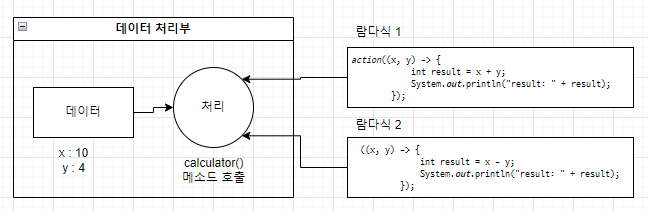 데이터는 똑같고 어떤 람다식을 대입하느냐에 따라 처리 결과가 달라진다.
