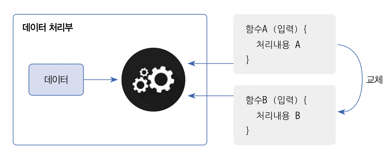 함수형 프로그래밍 함수형 프로그래밍이란 함수를 정의하고 이 함수를 데이터 처리부로 보내 데이터를 처리하는 기법을 가진다. 데이터 처리부는 데이터만 가지고 있을 뿐, 처리 방법이 정해져 있지 않아 외부에서 제공된 함수에 의존한다. 즉, 함수에 어떤 처리코드가 적혀있느냐에 따라 해당 데이터를 가지고 발생하는 실행결과가 달라질 수 있다는 뜻이다.