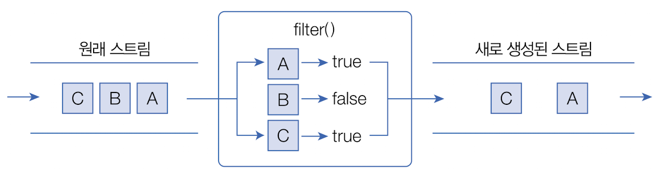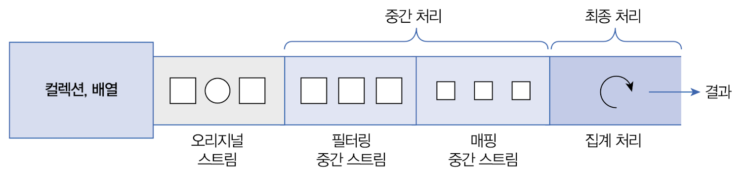 - 아래의 그림을 보면 컬렉션의 오리지널 스트림 뒤에 필터링 중간 스트림이 연결 되고, 그 뒤에 매핑 중간 스트림이 연결된다.