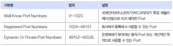 프로그램에서 사용할 수 있는 전체 Port 번호의 범위는 0~65535로, 아래와 같이 사용 목적에 따라 세 가지 범위를 가진다.