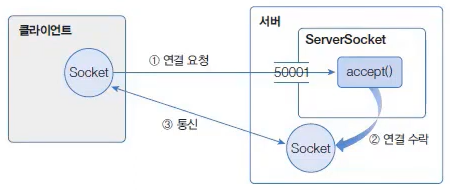 ServerSocket은 accept() 메소드로 연결 수락을 하고 통신용 Socket을 생성한다.