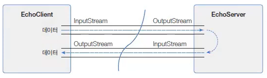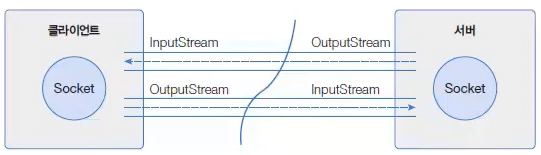 클라이언트가 연결 요청을 하고 서버가 연결 수락을 했다면, 아래의 그림과 같이 양쪽 Socket 객체로부터 각가 입력 스트림과 출력 스트림을 얻을 수 있다.
