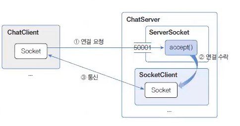 - ChatServer 클래스에는 ServerSocket 객체가 50001번 포트로 들어오는 클라이언트 연결 요청을 수락한다.