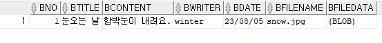 Board [bno=1, btitle=눈오는 날, bcontent=함박눈이 내려요., bwriter=winter, bdate=2023-08-05, bfilename=snow.jpg, bfiledata=oracle.sql.BLOB@35841320]