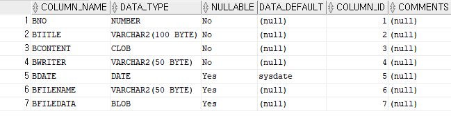 INSERT INTO boards (bno, btitle, bcontent, bwriter, bdate, bfilename, bfiledata) VALUES (SEQ_BNO.NEXTVAL, '눈 오는 날', '함박눈이 내려요', 'winter', SYSDATE, 'snow.jpg', 'binaryData') |