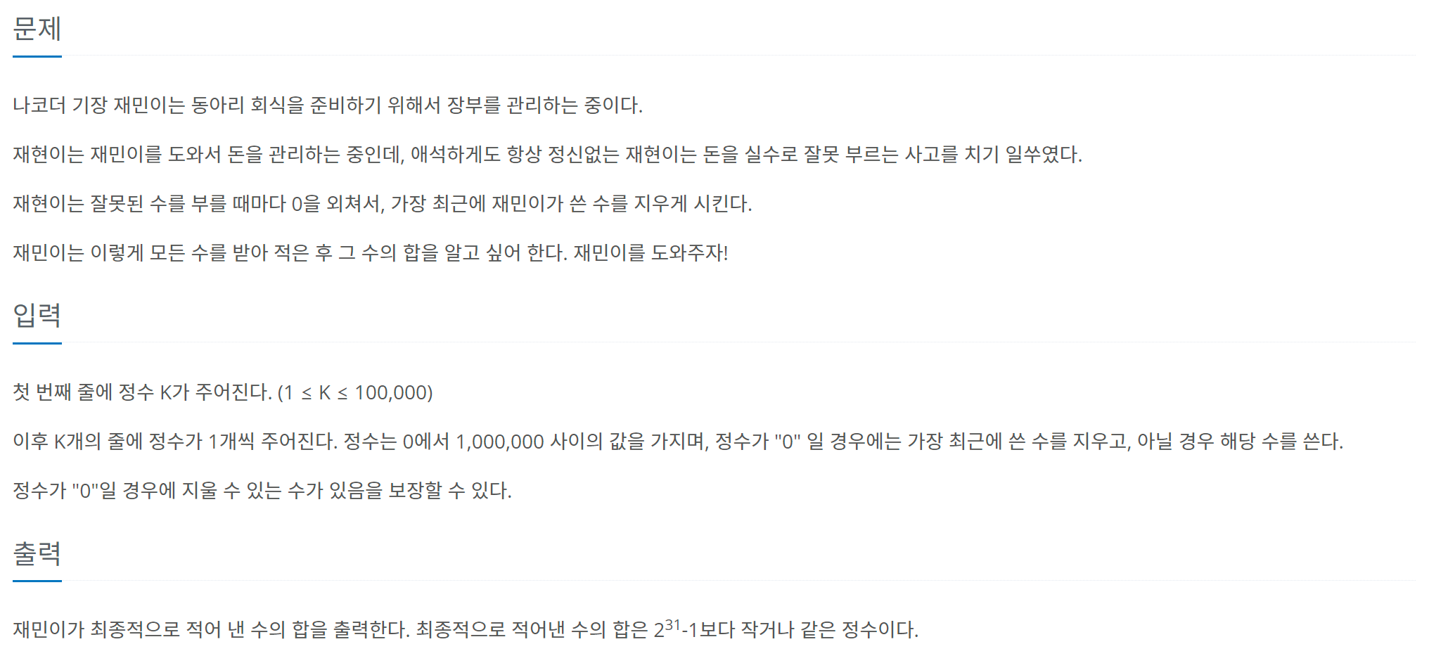 [Java] 백준 10773번 문제 (제로)자료구조 & 알고리즘/BOJ2023. 8. 6. 20:24