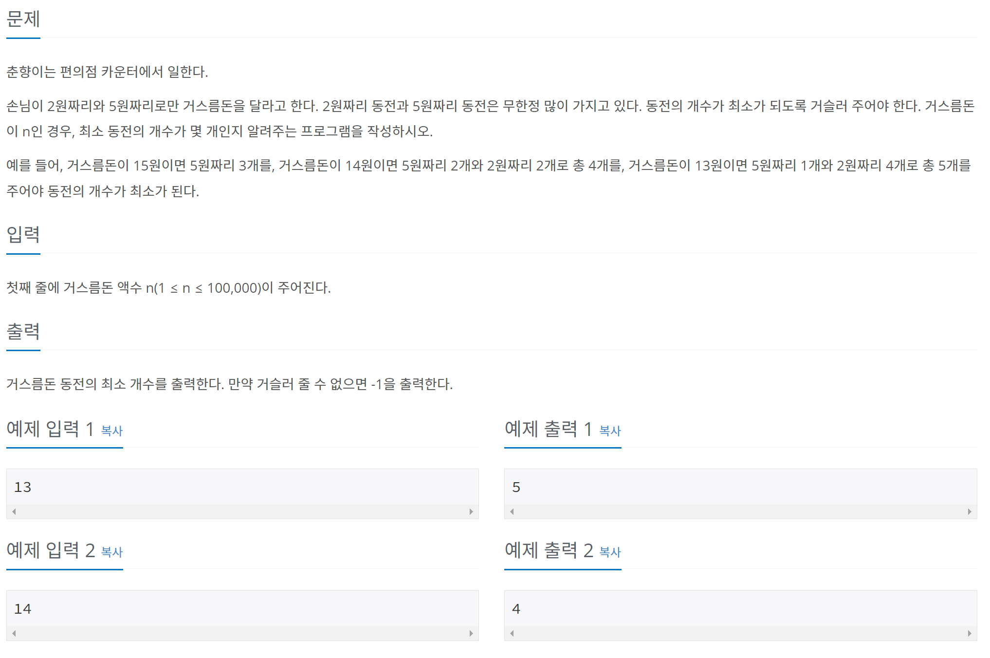 [Java] 백준 14916번 문제 (거스름 돈)자료구조 & 알고리즘/BOJ2023. 8. 11. 08:11