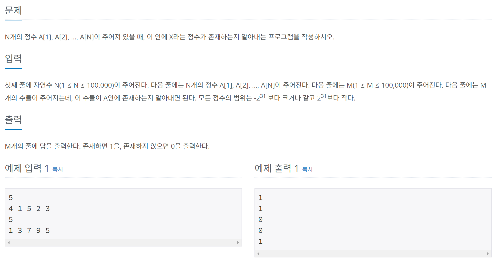 // if(Arrays.binarySearch(nArr, i) >= 0) System.out.println(1); // 이미 누군가 구현해놓은 이진탐색 라이브러리