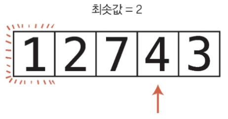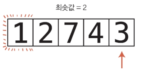 인덱스 1의 값은 2이며, 이 값이 두 번째 패스수루의 현재 최솟값이다.