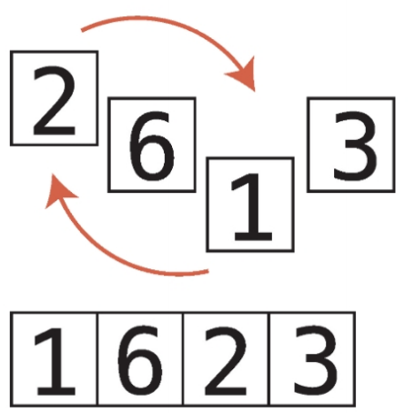 2. 최솟값이 어느 인덱스에 있는지 알았으므로 그 인덱스의 값과 패스스루를 처음 시작했을 때의 값을 교환한다. 패스스루를 시작했을 때 인덱스는 첫 패스스루에서는 인덱스 0일 것이고, 두 번째 패스스루에서는 인덱스 1일 것이다.