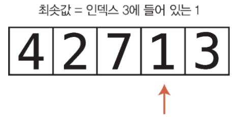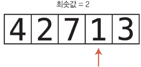 1. 배열의 각 셀을 왼쪽부터 오른쪽 방향으로 확인하면서 어떤 값이 최솟값인지 결정한다. 한 셀씩 이동하면서 현재까지 가장 작은 값을 기록한다.(실제로는 그 인덱스를 변수에 저장) 변수에 들어 있는 값보다 작은 값이 들어 있는 셀을 만나면 변수가 새 인덱스를 가리키도록 값을 대체한다.