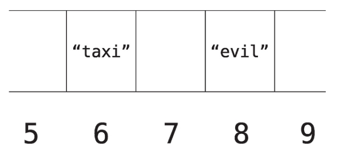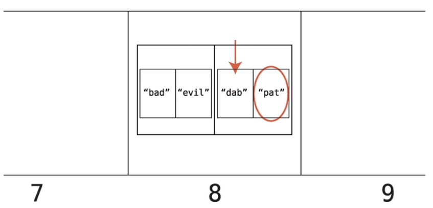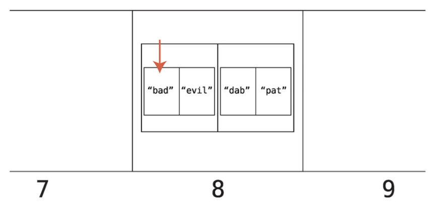 키("bad")는 8로 해싱되므로 컴퓨터는 값("evil")을 아래와 같이 셀 8에 넣는다.