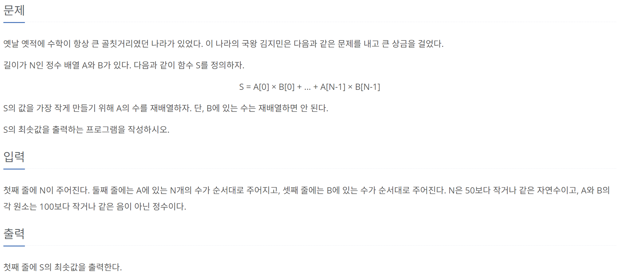 - A는 오름차순으로 정렬하고, B는 내림차순으로 정렬하여 인덱스가 같은 수 끼리 곱해서 더한 값을 출력한다.