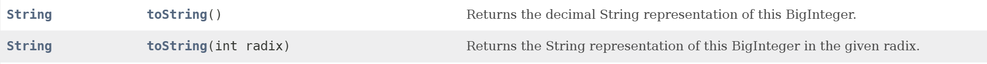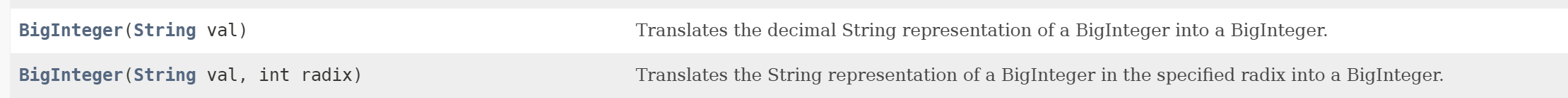 - 공식 문서를 확인해보면 BigInteger 클래스의 생성자 매개변수는 우리가 흔히 사용하는 String 타입으로 받는 경우와 int 타입 변수 하나를 더 받는 생성자가 있다.