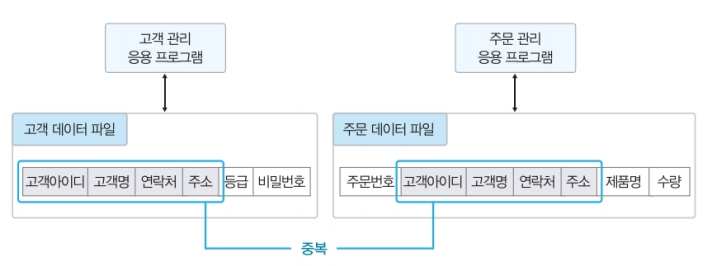 같은 내용의 데이터가 여러 파일에 중복 저장된다. 예를 들어, 고객 관리 담당자는 고객 데이터를 파일에 저장해두고 고객 관리 응용 프로그램을 이용해 고객 관리에 필요한 업무를 처리한다. 마찬가지로 주문 관리 담당자도 주문 내역 데이터를 파일에 저장해두고 주문 관리 응용 프로그램의 도움을 받아 제품 주문과 관련한 업무를 처리한다.