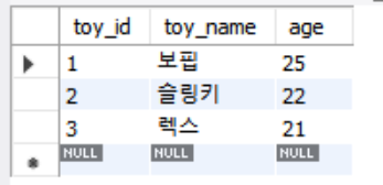 우선 간단한 테이블을 만든다(아이디(toy_id) 열을 자동 증가로 설정)