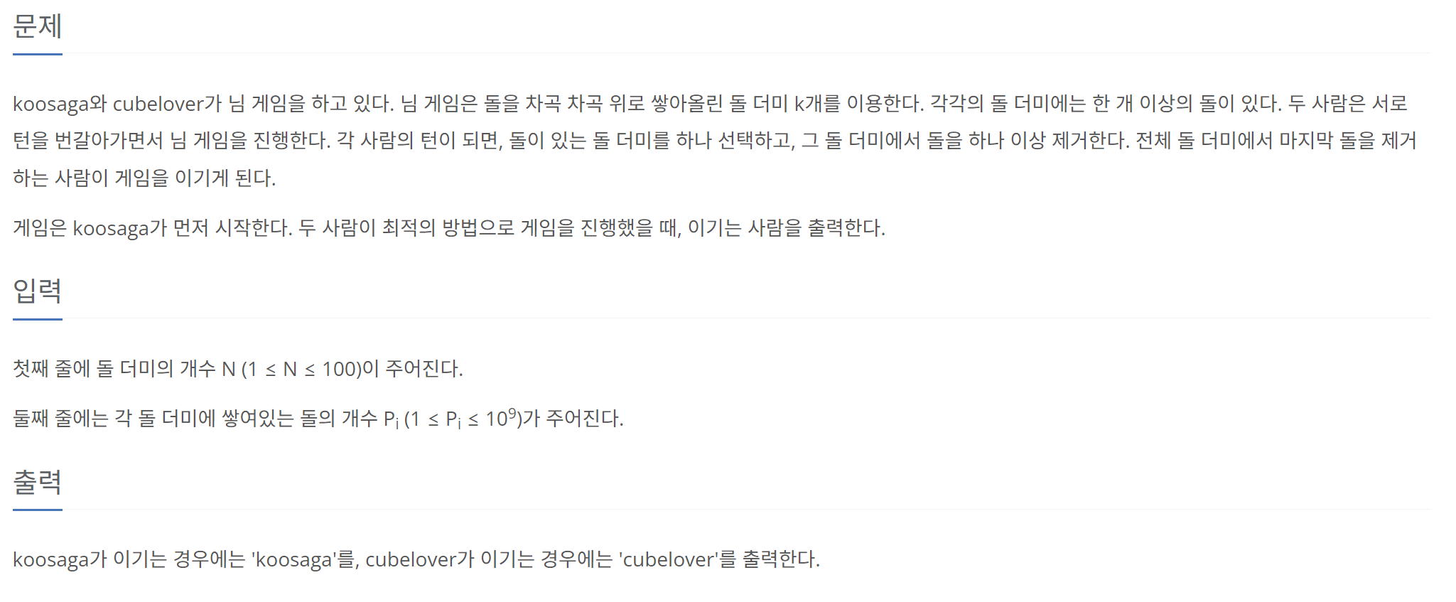 0011 XOR 0011 = 0000(= 1 XOR 2 XOR 3) - 첫 시작은 koosaga이므로 각 돌더미의 개수 XOR 값이 0(이진수로 0000)이면 cubelover가 승리하고, 0이 아니면 koosaga가 승리한다.