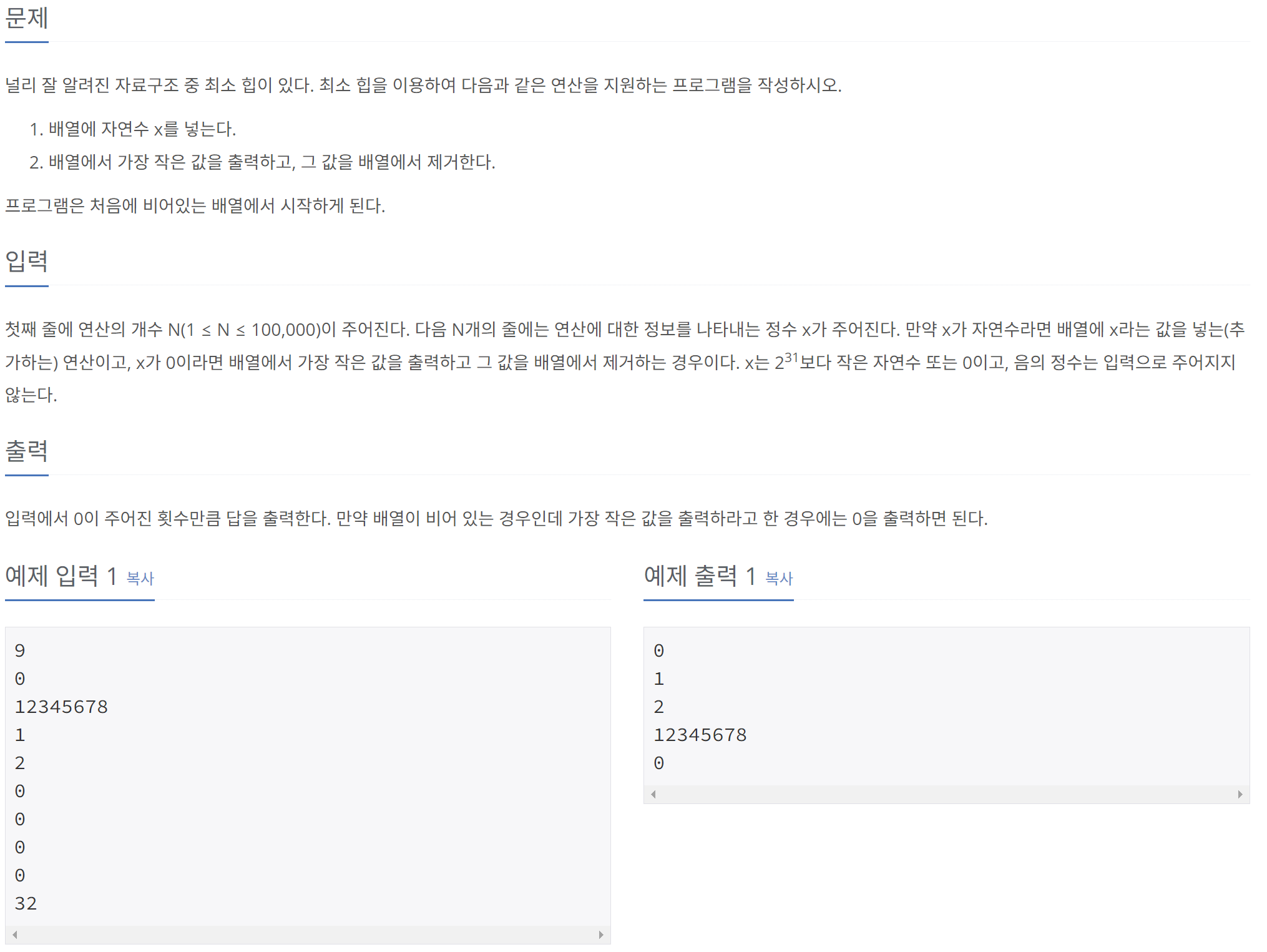 [Java] 백준 1927번 문제 (최소 힙)자료구조 & 알고리즘/BOJ2023. 10. 22. 03:06