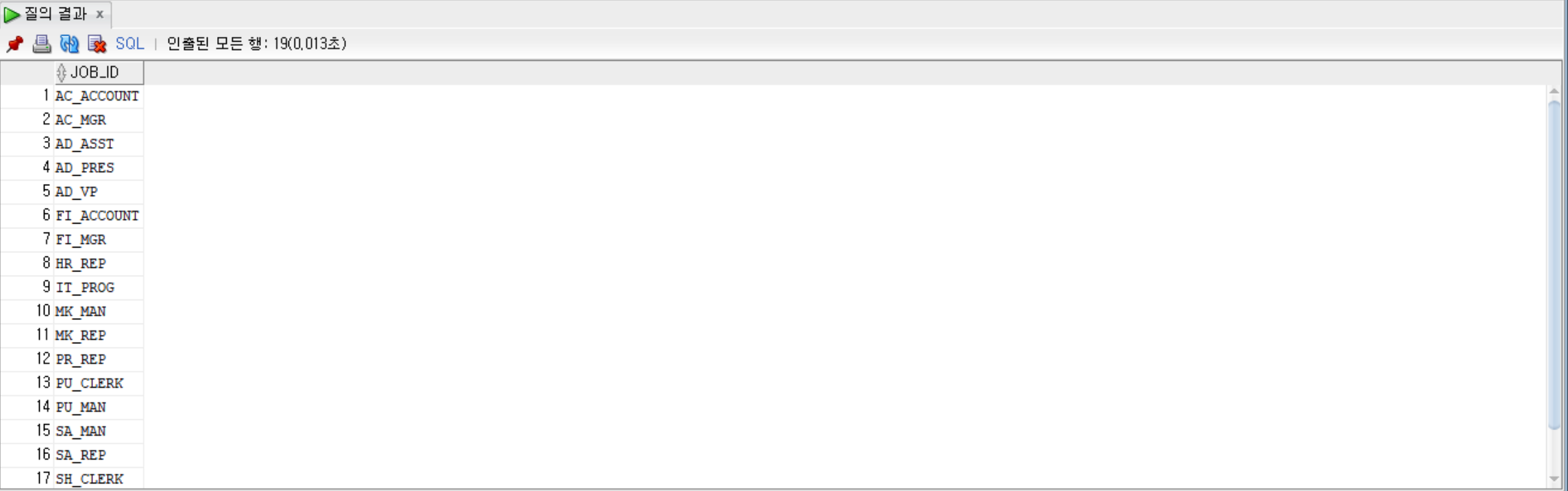 SELECT DISTINCT job_id FROM employees; --중복 제거