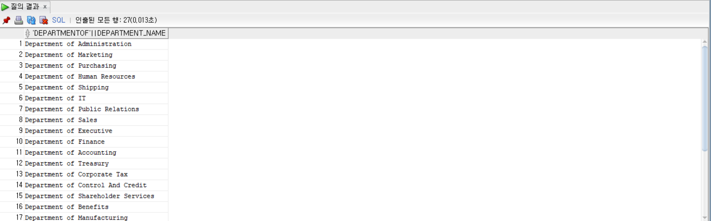 SELECT 'department of ' || department_name from departments; --문자열과 컬럼 결합
