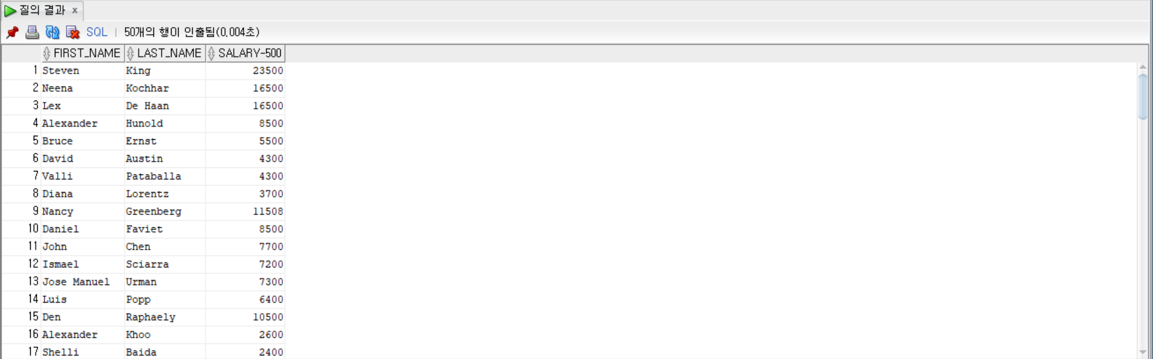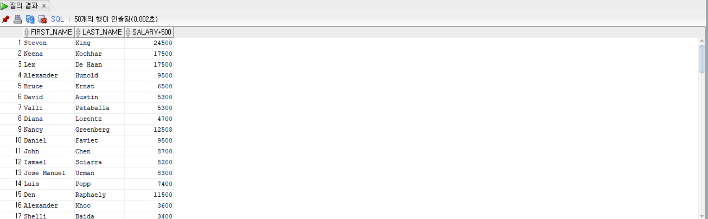 SELECT first_name, last_name, salary + 500 FROM employees;