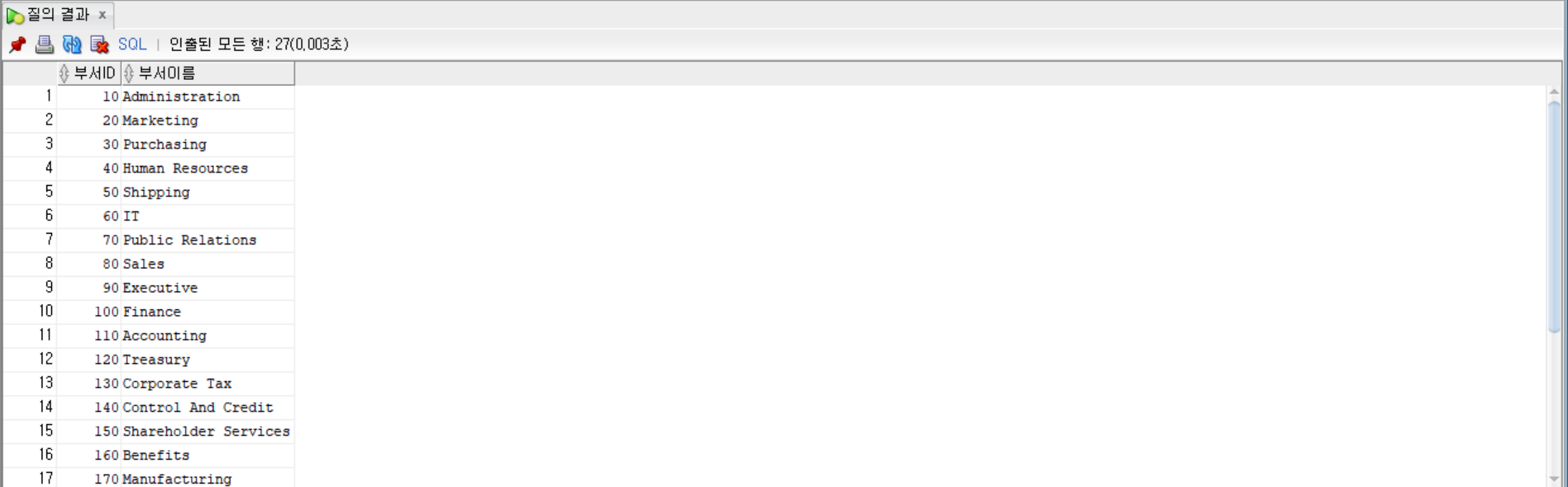 SELECT department_id AS 부서ID, department_name AS 부서이름 from departments; --원하는 컬럼 이름으로 출력