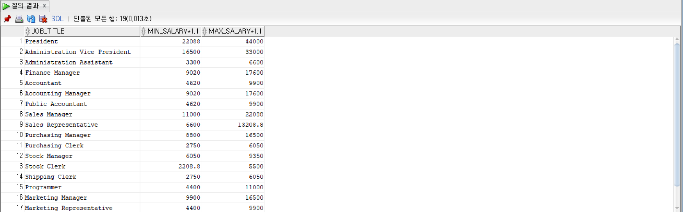 SELECT job_title, min_salary * 1.1, max_salary * 1.1 FROM jobs;