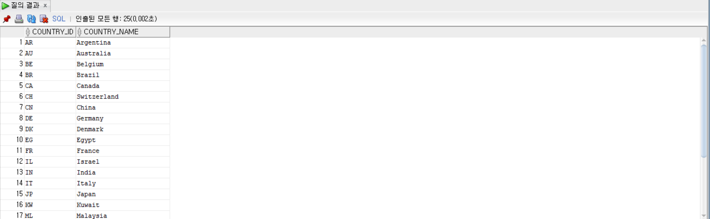 SELECT * FROM countries; --countries 테이블 조회