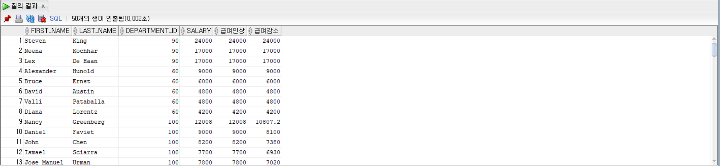 DECODE(department_id, 50, salary * 1.1, salary) AS 급여인상,