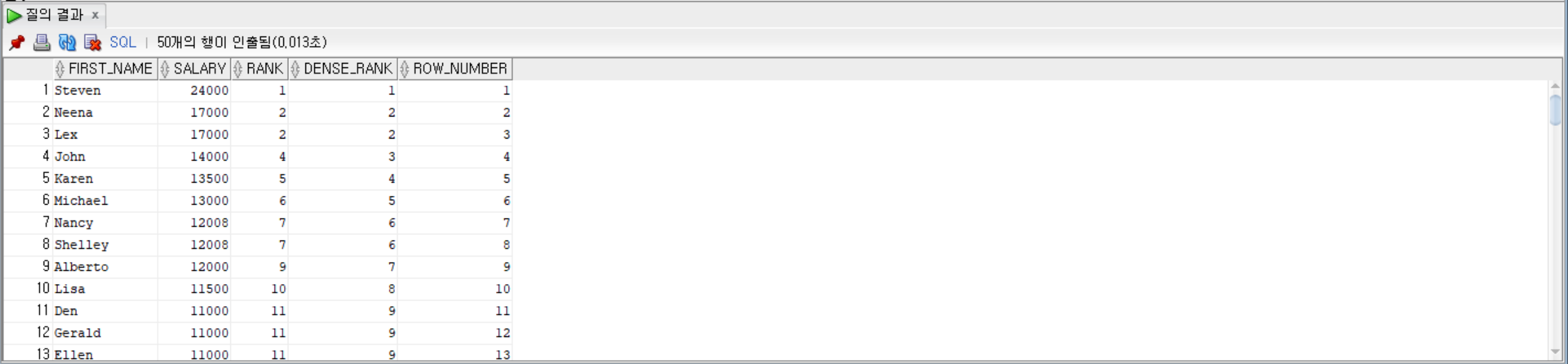 • DENSE_RANK(): 공통 순위를 건너뛰지 않고, 다음 순위를 출력하는 순위