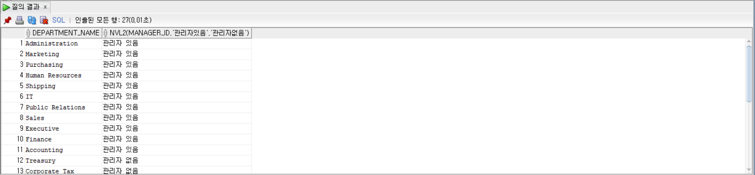 SELECT department_name, NVL2(manager_id, '관리자 있음', '관리자 없음') FROM departments;