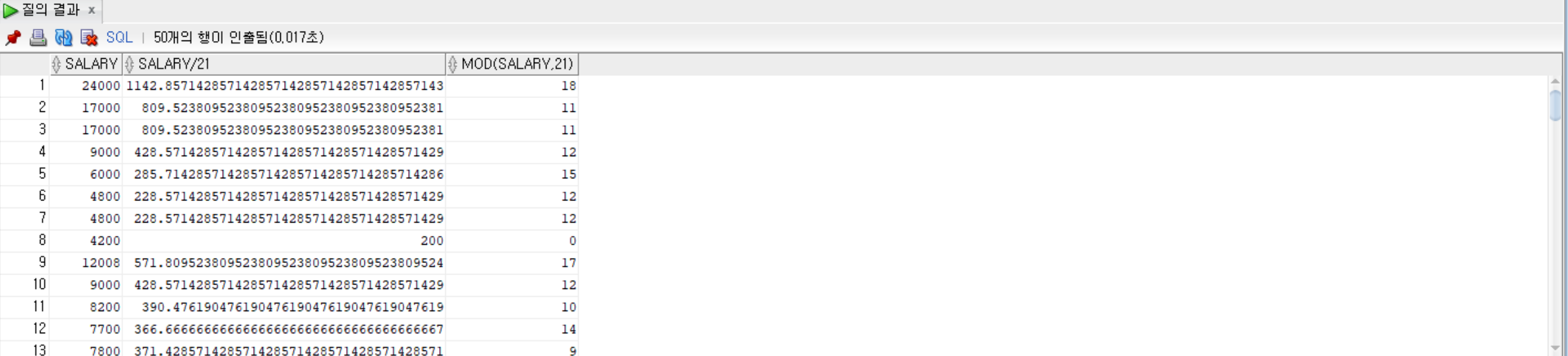 SELECT salary, salary/21, MOD(salary, 21) FROM employees;