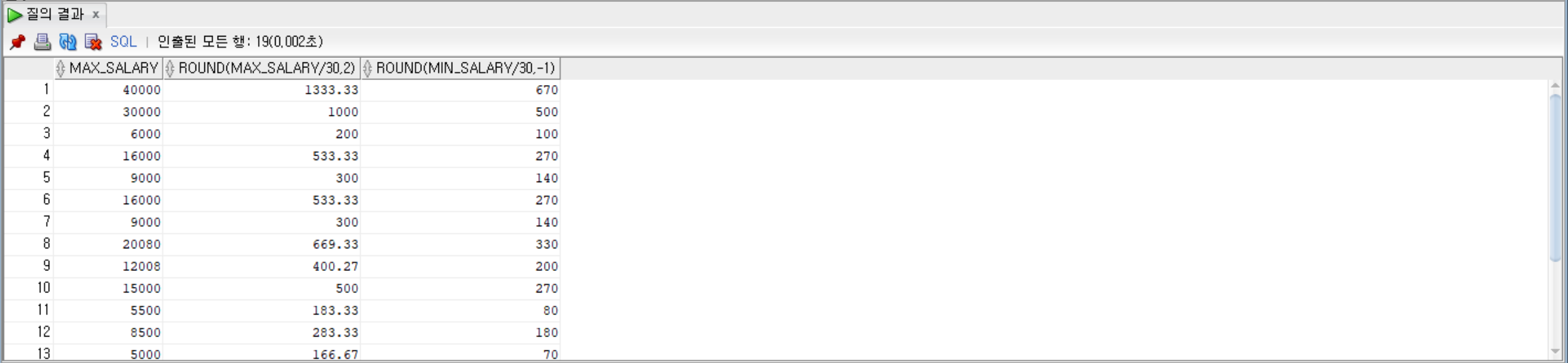 -- jobs 테이블에서 max_salary 값을 30으로 나눈 값을 소수점 둘째 자리에서 반올림한 값과 정수 첫째 자리에서 반올림한 값을 조회