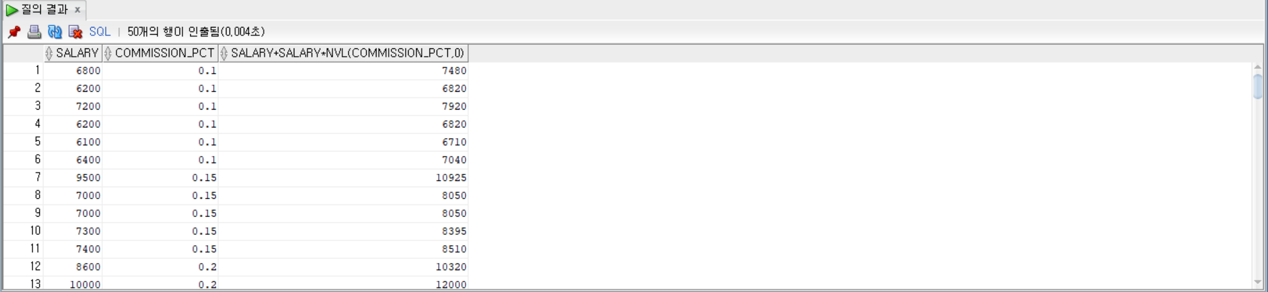 SELECT salary, commission_pct, salary + salary * NVL(commission_pct, 1)