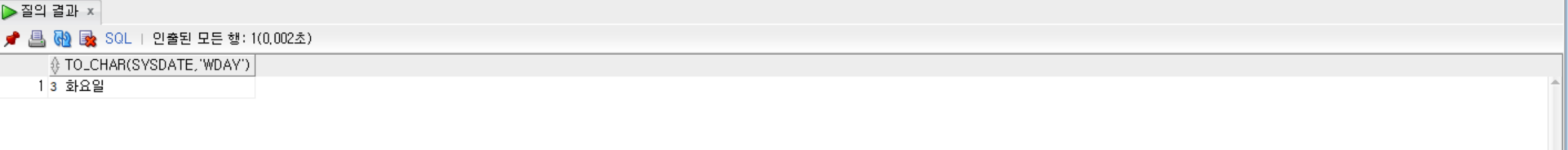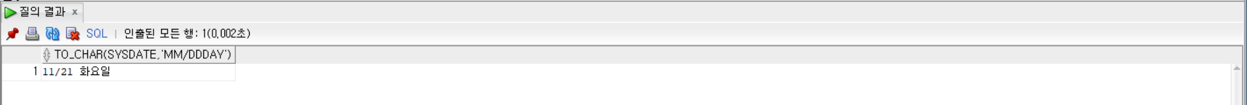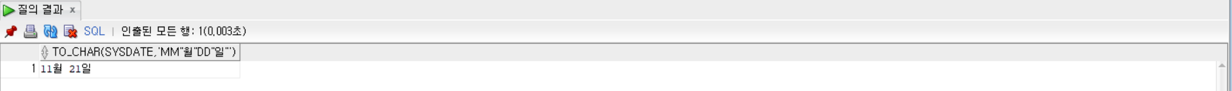 SELECT TO_CHAR(SYSDATE, 'MM"월" DD"일"') FROM dual;