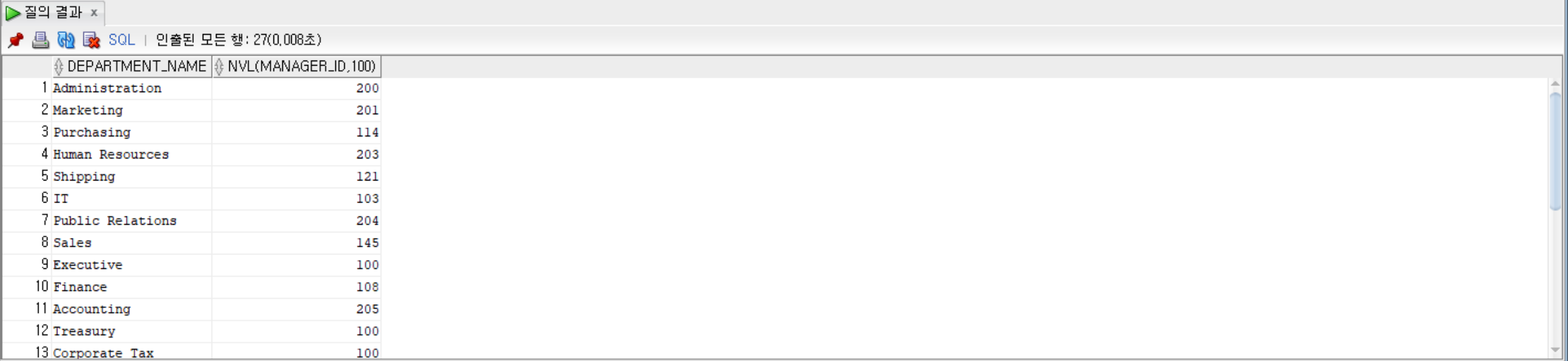 SELECT department_name, NVL(manager_id, 100) FROM departments;