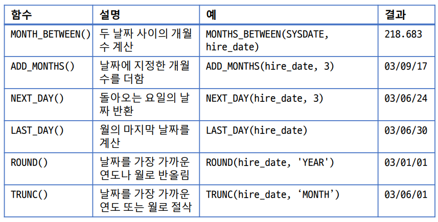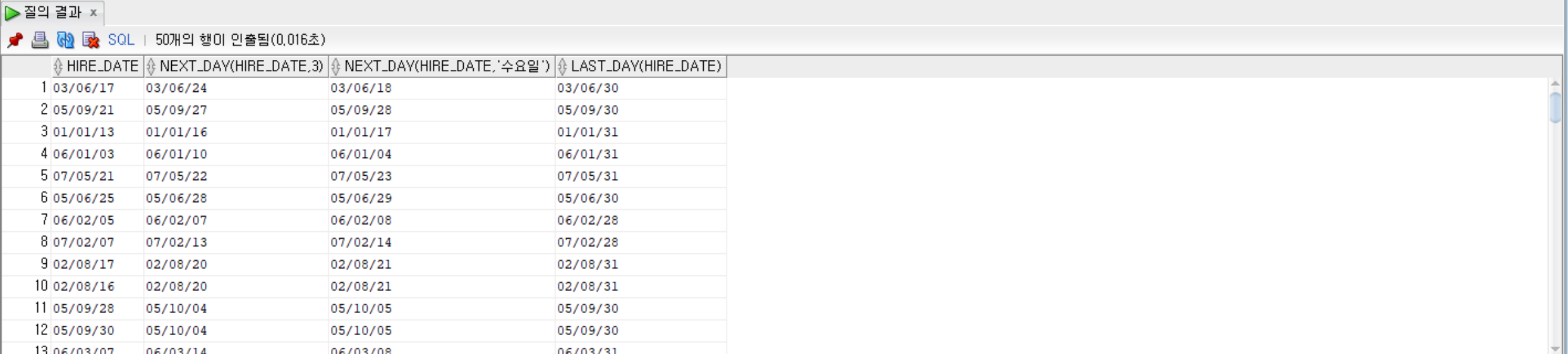 NEXT_DAY(hire_date, 3), NEXT_DAY(hire_date, '수요일'), LAST_DAY(hire_date)