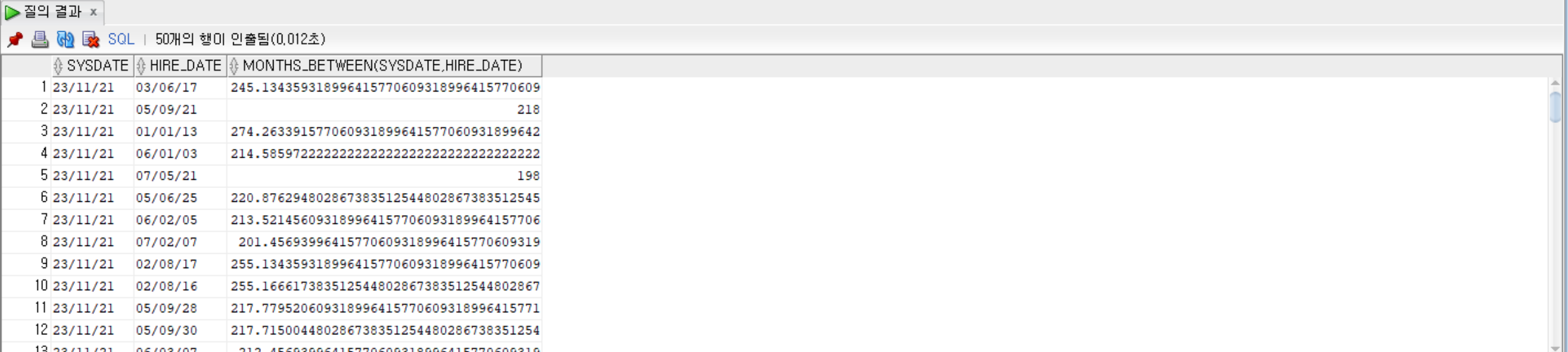 SELECT SYSDATE, hire_date, MONTHS_BETWEEN(SYSDATE, hire_date) FROM employees;