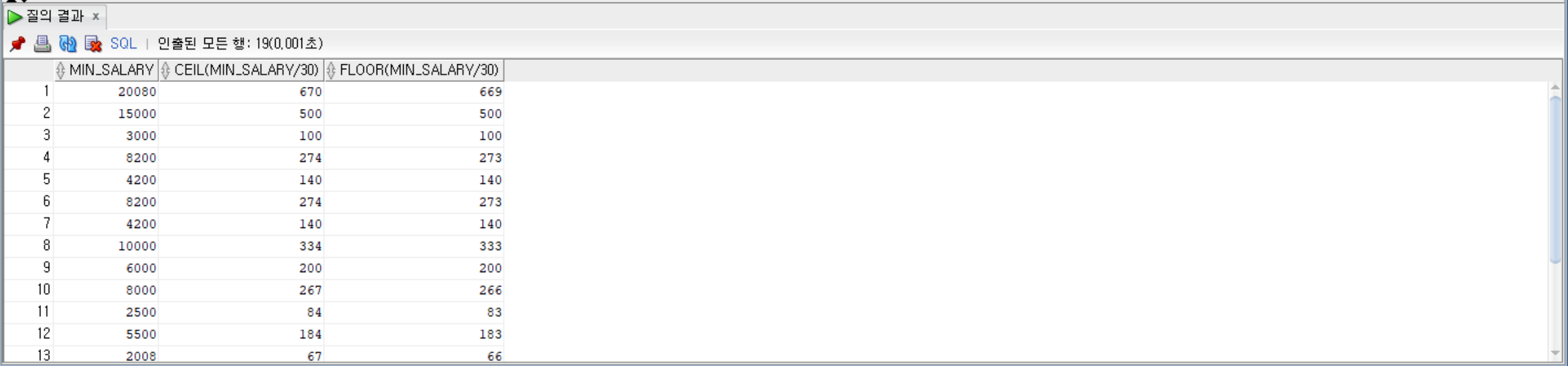 SELECT min_salary, CEIL(min_salary / 30), FLOOR(min_salary / 30) FROM jobs;